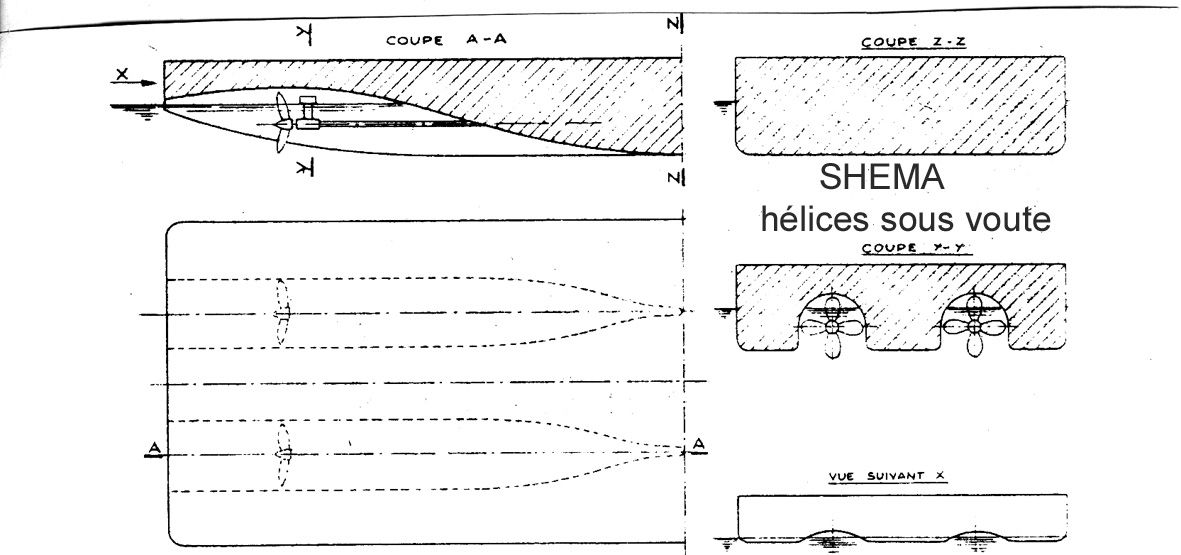 Eu égard au faible tirant d’eau, l’usage d’hélices libres n’est pas indiqué. Le premier pas vers une appropriation aux besoins de mouillages réduits, est l’adoption d’une voûte ou tunnel s’ouvrant dans le tableau arrière et se prolongeant vers l’avant sur une certaine distance. La forme est semi-cylindrique et le raccordement aus bordées des fonds se fait à arrêtes vives. L’hélice placée sous ce tunnel, n’est que partiellement immergée. A l’arrêt, la partie supérieure de cette voûte est remplie d’air. Lorsque l’hélice tourne, il se crée une succion qui aspire l’air vers l’arrière. En peu de temps, le tunnel est complètement noyé et l’hélice fonctionne comme si elle travaillait en pleine eau. En marche avant, pour peu que des formes bien conçues de la coque le permettent un large afflux d’eau à l’hélice, le rendement est acceptable. Par contre en marche arrière, l’hélice fait office de pompe centrifuge, chasse l’eau du tunnel et aspire l’air. Travaillant lors dans un mélange d’eau et d’air suffisamment dense, le rendement est défavorable et la manoeuvrabilité du bateau, mauvaise. Avant de passer àl’exposé de solutions meilleures et plus récentes apportées au problème de la propulsion par hélice, il convient de faire le point, quant à ce premier stade de l’évolution du matériel. Le tableau ci-après, donne un aperçu des caractéristiques principales des remorqueurs utilisés au Congo avant l’apparition des techniques nouvelle