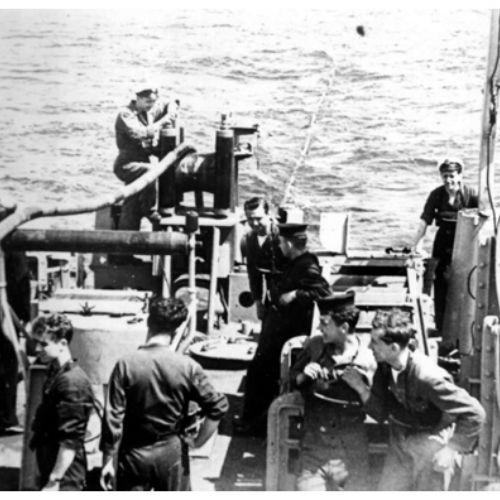 Campagne de déminage en mer du Nord en juin 1950. Dans la zone d'opération, située à 25 km de la côte.