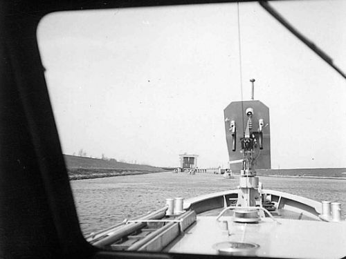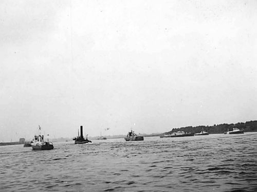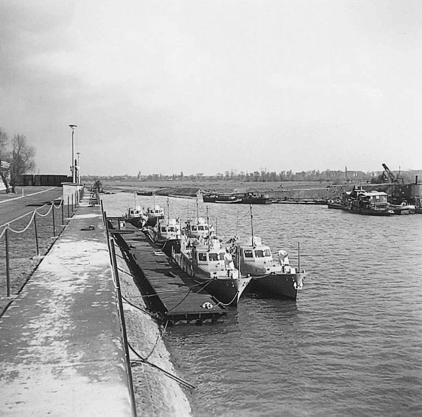 Puis eut lieu le défilé saisissant des six vedettes belges, de quatre bateaux de la British Rhine Flotila, de deux bateaux de l'Escadrille française et de deux bateaux de la Rhine River Patrol,appartenant aux Forces américaines.