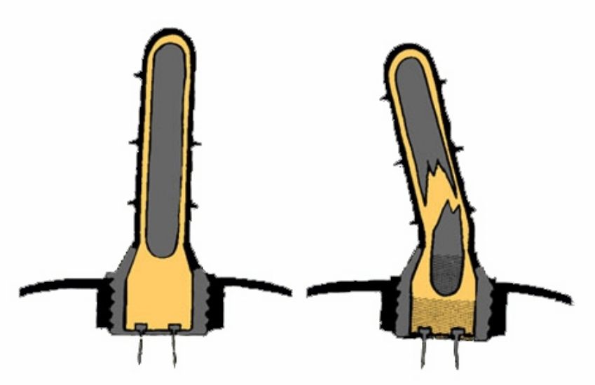 Corne de HerzDans la corne de Herz une solution de bichromate coule sur les plaquettes de carbone et de zinc lorsque le verre se brise. Ainsi se crée un élément de batterieproduisant le courant nécessaire pour déclencher la chaîne explosive.