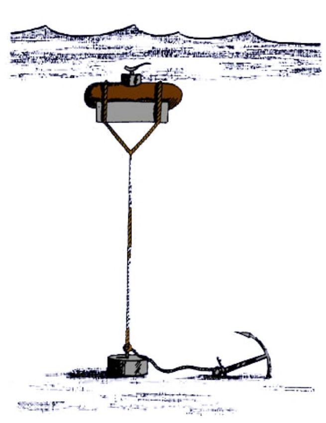 Un problème avec les mines ancrées était que l’on devait d’abord faire des sondages pour donner à l’orin sa longueur exacte. Une solution ingénieuse pour ceci était le plomb de sonde (1876).