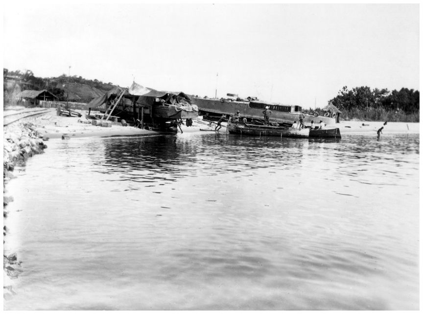 Sans perdre un instant je me rends sur les lieux de l'explosion tout en tirant le canon et la mitrailleuse sur les soldats, équipage et porteurs se trouvant sur la berge, environ 200 hommes qui furent complètement dispersés et s'enfuirent en désordre abandonnant leurs charges composées spécialement de caisses et de tôles ondulées. A 200 mètres de la côte ne trouvant pas d'autres objectifs, le poste fut à son tour bombardé à fond. L'action dura jusqu'à 8 heures.