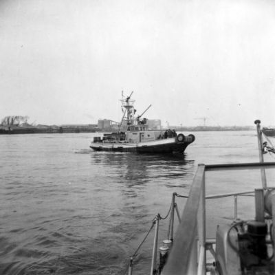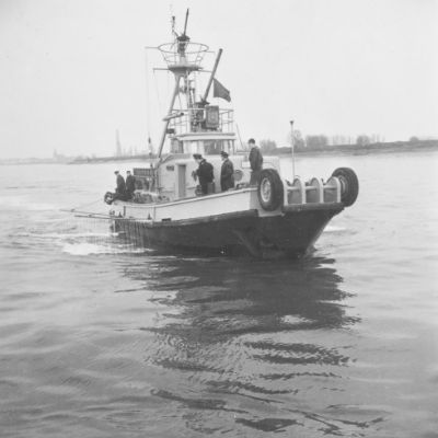 Remorqueur portuaire avec lance à incendie.