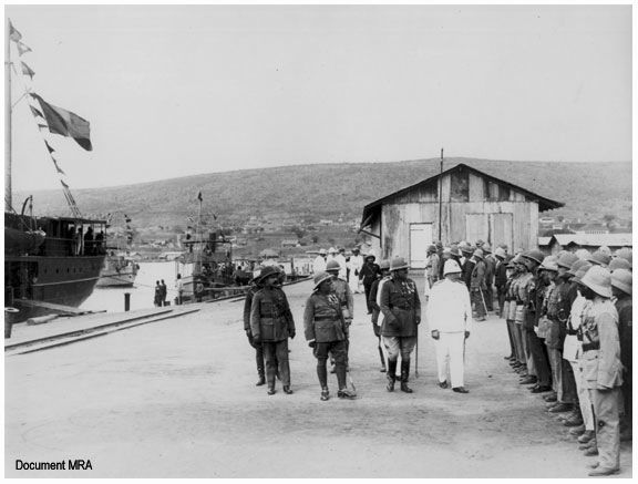 Troupes coloniales belges, campagne de Tabora. Après la victoire de 1918 réception du Gouverneur Général du Congo.