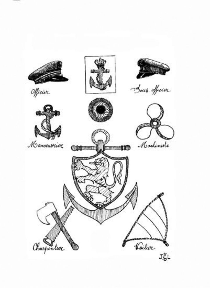 le tricot est orné sur la poitrine d’une broderie représentant un écu au lion dressé, le tout posé sur une ancre.