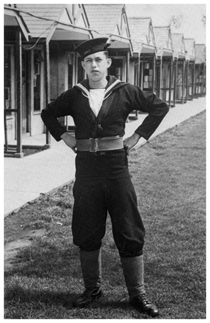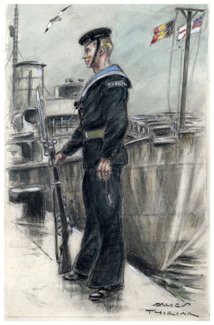 Le matelot portait un "jumper", vareuse de marin de gros drap de laine bleu marine, ceintré à la taille et large aux épaules, sa profonde échancrure laissant voir le "white front", chemisette blanche à manches courtes et au col liseré d’un ruban de coton bleu portée l’été, ou un "jersey" en tricot de laine bleu marine à longues manches, l’encolure droite au ras du cou, porté l’hiver. Le col marin "blue jean collar" de coton bleu marine qui a la propriété de se décolorer au lavage, devenant bleu clair, est bordé d’un ruban de coton tissé de trois raies blanches dont la légende tenace dans les "lower decks" en fait la symbolique représentation des trois grandes victoires de Nelson, à savoir Le Nil (Aboukir) le 1.8.1798, Copenhague le 1.4.1801 et Trafalgar le 21.10.1805. Sous le col marin un foulard de soie noire est noué au bas de l’encolure du jumper. Ce foulard officiellement appelé "black silk handkerchief" mais communément connu sous le nom de "Nelson" est supposé être un signe de deuil commémorant la mort de l’amiral anglais à Trafalgar. Il est de forme rectangulaire mesurant 50 par 12 inches et est plié en longueur en quatre. Le jumper est muni de deux poches intérieures de poitrine et ses manches se terminent par une manchette fermée de deux boutons noirs. Ceci pour la tenue n°1, la tenue de travail de bord plutôt, le n°2, n’a pas de manchettes boutonnées. Le jumper est long et recouvre les hanches et par conséquent les poches du pantalon. Gênant pour ceux qui ont l’habitude de se balader les mains dans les poches!