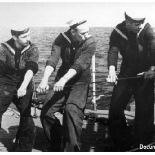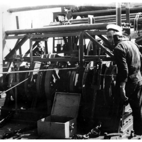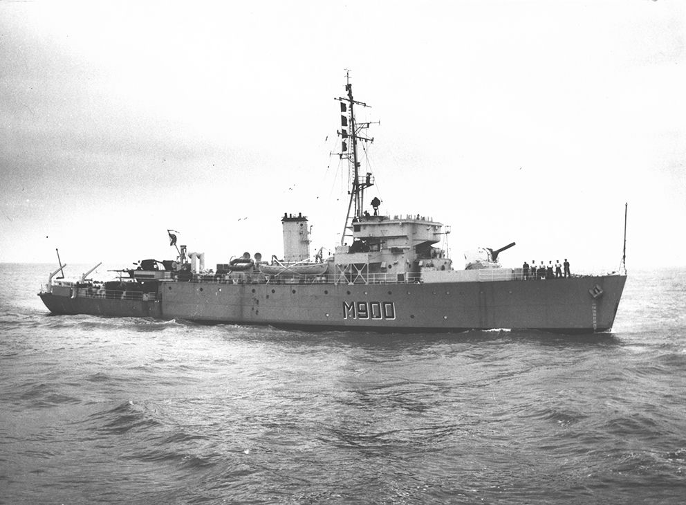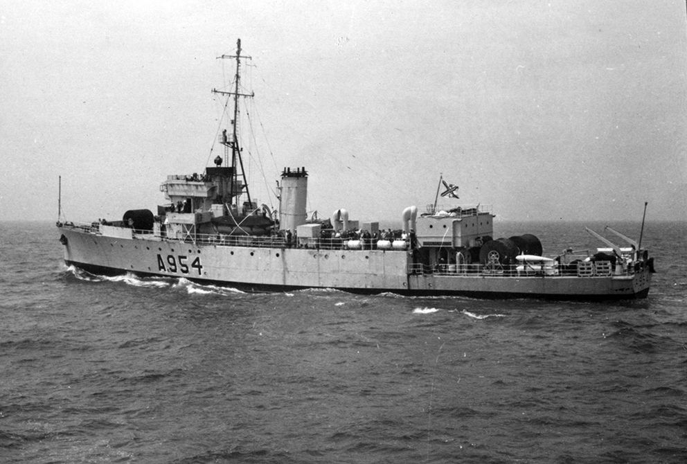 Campagne de déminage en mer du Nord en juin 1950. Dans la zone d'opération, située à 25 km de la côte.