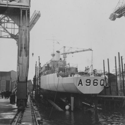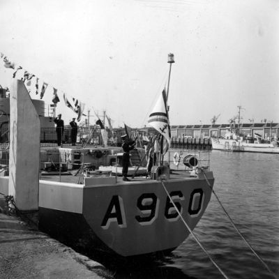 Il s'agit du "A960 Godetia" qui sera à la fois un bâtiment de commandement et de support logistique et un garde-pêche. Le "A960 Godetia" a eu pour marraine Mme Moyersoen en l'absence de S.M. la Reine retenue par le deuil de la cour. Le baptême du "A960 Godetia" a eu lieu selon les formes traditionnelles bris symbolique d'une bouteille de champagne contre l'étrave du navire dans les eaux de l'Escaut aux accents de la "Brabançonne" exécutée par la musique de la Force Navale. Le "Godetia" a été nommé ainsi en souvenir de la corvette "HMS Godetia" de la Royal Navy, qui au cours de la dernière guerre arborant côte à côte le pavillon britannique et les couleurs belges avait été confiée aux marins belges enrôlés dans la "Royal Navy Section belge" sous le commandant Larose. Ce dernier détail a été révélé par M. Moyersoen au cours de la séance académique qui a suivi le lancement et qui s'est tenu à l'Hôtel de Ville de Tamise.