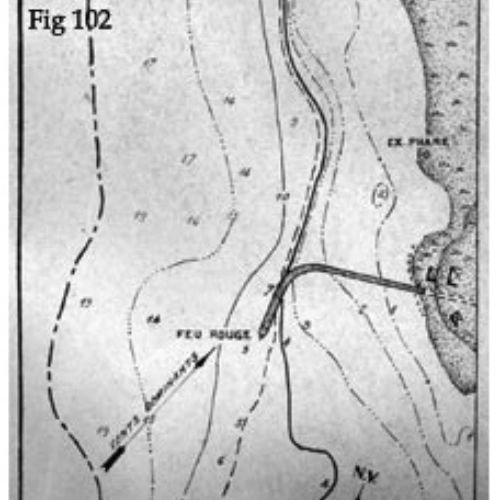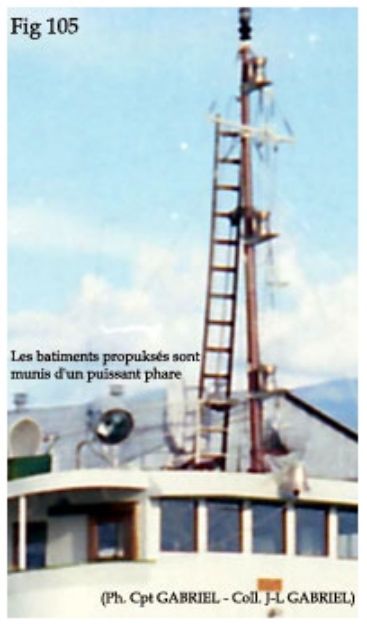 L'accès et l'approche de certains ports sont balisés par un système de bouées de formes et de couleurs différentes. Ces bouées sont munies de voyants recouvert de Scotch-lite, substance à haut pouvoir réfléchissant. Dès qu'un voyant est effleuré par la lumière d'un projecteur, il apparaît luminescent dans la nuit. A cet effet, les bâtiments propulsés sont munis de puissant projecteurs (fig 105)
